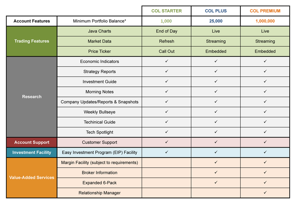 Customer Support/Helpdesk - You may tap the services of COL Financial's Helpdesk or Customer Support group to answer questions about account opening, website use, brokerage services, and other pieces of general information (non-inclusive of market advisory information). You may call COL Financial's hotline at 6-515-888 or email us at helpdesk@colfinancial.com
